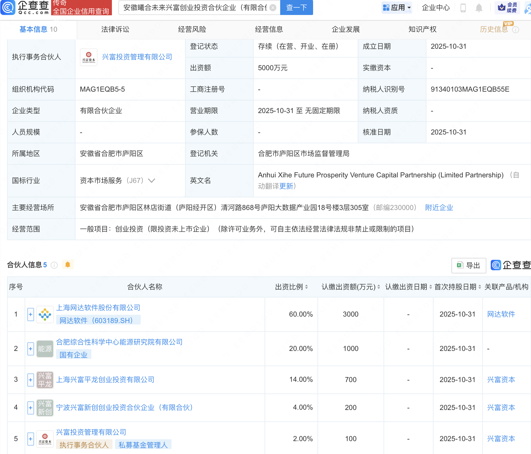近日配资门户网中心官网,安徽曦合未来兴富创业投资合伙企业(有限合伙)成立,出资额5000万元,经营范围包含:创业投资(限投资未上市企业)。企查查股权穿透显示,该企业由网达软件(603189)等共同出资。