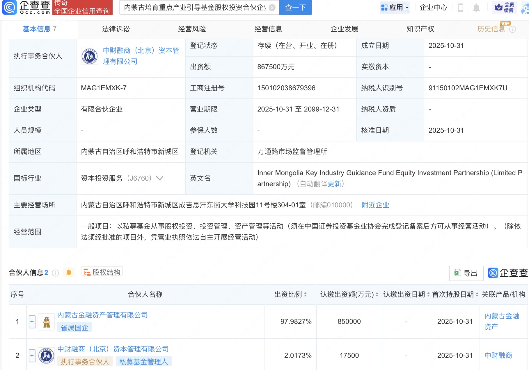 近日,内蒙古培育重点产业引导基金股权投资合伙企业(有限合伙)成立,出资额86.75亿人民币,经营范围包括以私募基金从事股权投资、投资管理、资产管理等活动。企查查股权穿透显示实盘配资网,该企业由内蒙古金融资产管理有限公司、中财融商(北京)资本管理有限公司共同出资。